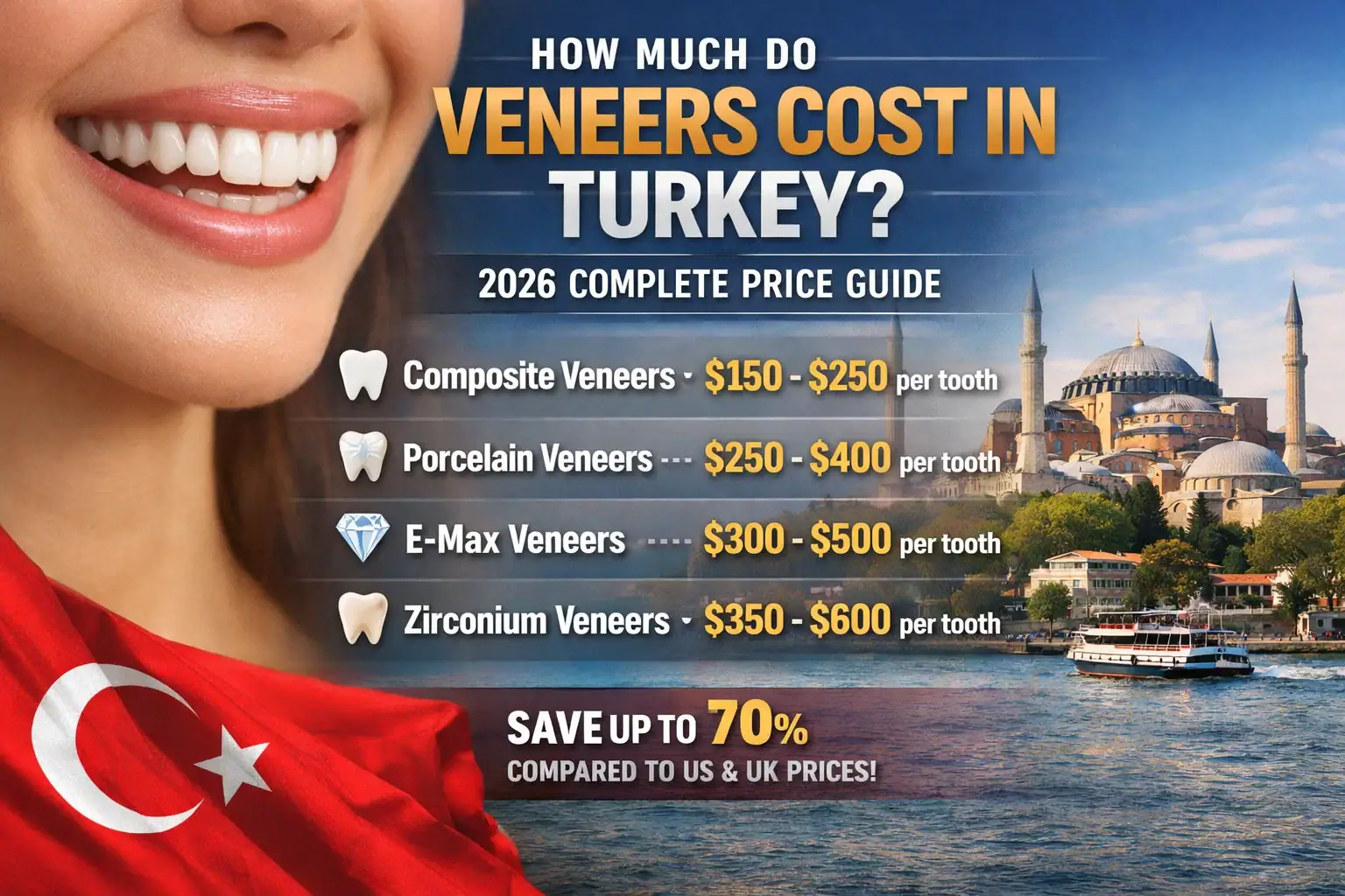 If you've been researching a smile makeover, one question keeps coming up: How much do veneers cost in Turkey? You're not alone. Every year, hundreds of thousands of patients from the UK, Germany, the USA, and across Europe travel to Turkey and specifically to Istanbul to transform their smiles at a fraction of the cost they'd pay back home.